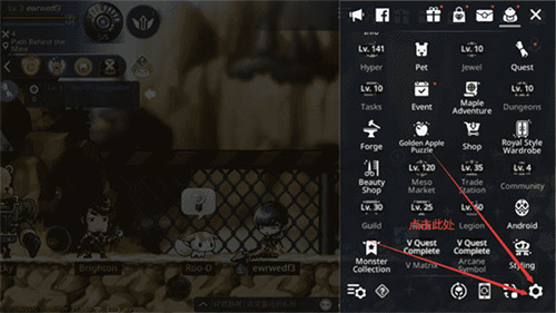 首先启动《冒险岛枫之传说》官方版本,即MapleStory M,进入游戏后点击右上角的三横线图标(通常在感叹号标记的位置)。
