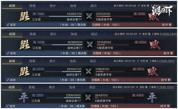 上图中的前2份战报,是我方武将对位敌方主将时得到的,而后2份战报则是我方武将没有对位敌方主将时得到的。我们会发现,将我方2名武将与敌方主将对位,可减少将近一半的伤亡,这无疑说明了对位武将的重要性。当主公在攻占1个地块的战损,与其他主公攻占2个地块的战损一样时,就会在很大程度上拖慢你的发育速度。