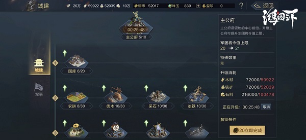 关键点7 尽早提高【城建】等级。花费更多时间将【农耕】、【伐木】、【采石】、【冶铁】这四项提升到10级,然后解锁【任命】。这样就可以享受到资源产量和采集效率的加成。
