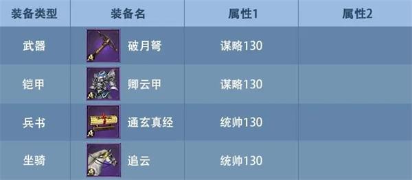 装备搭配:主谋略装,谋略越高 伤害越高。适当搭配统帅装,加厚血量。