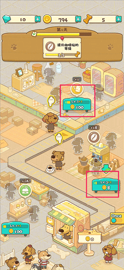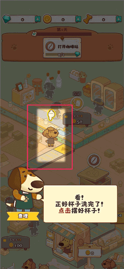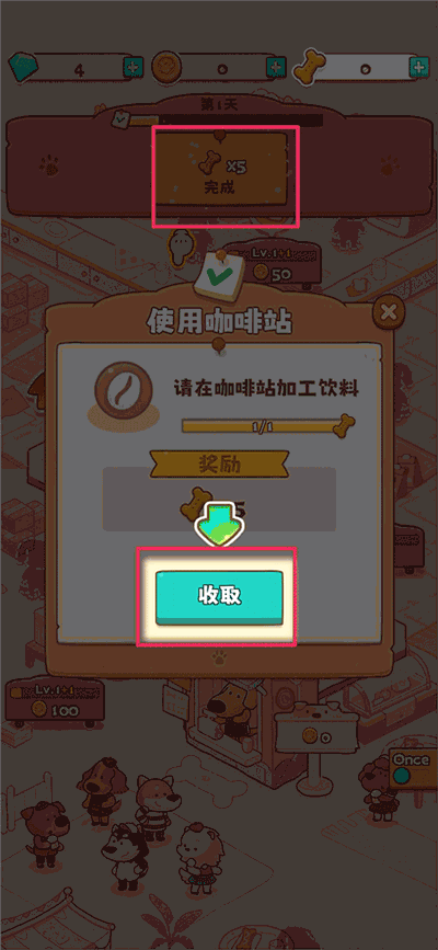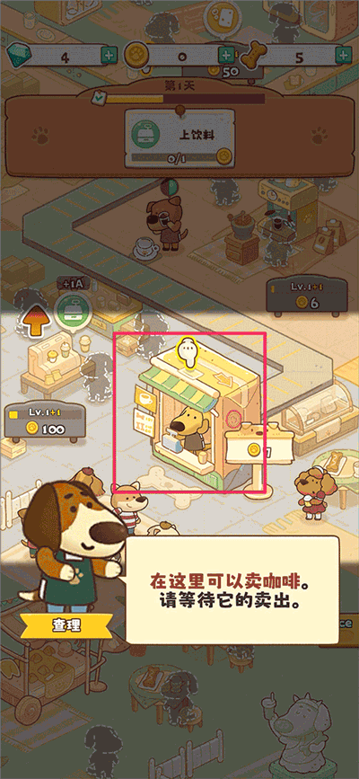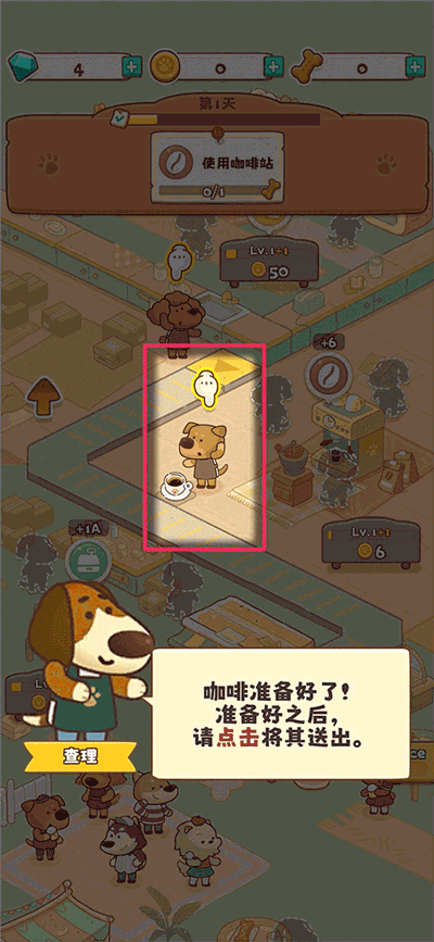 3、洗好的杯子会传送至咖啡馆,待负责做咖啡的小狗完成制作后点击即可送出