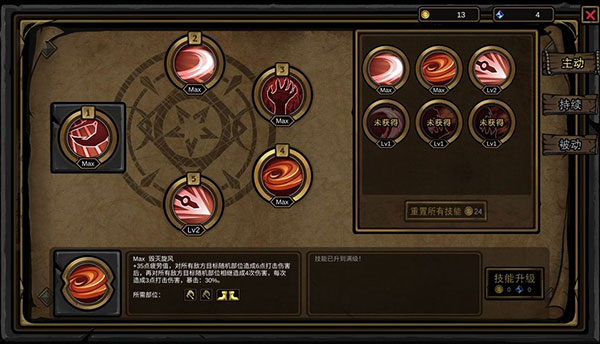 上图为血骑士核心技能,血骑士三段状态,得保证打boss的时候是第一状态,后面几个图boss大多是单人。用这个技能耗boss疲劳,被动和这个技能全满的情况下一次大约耗80点疲劳,一个boss三次技能秒杀。而且血骑士能打能抗,小怪靠恶魔之枪的50%晕眩打。
