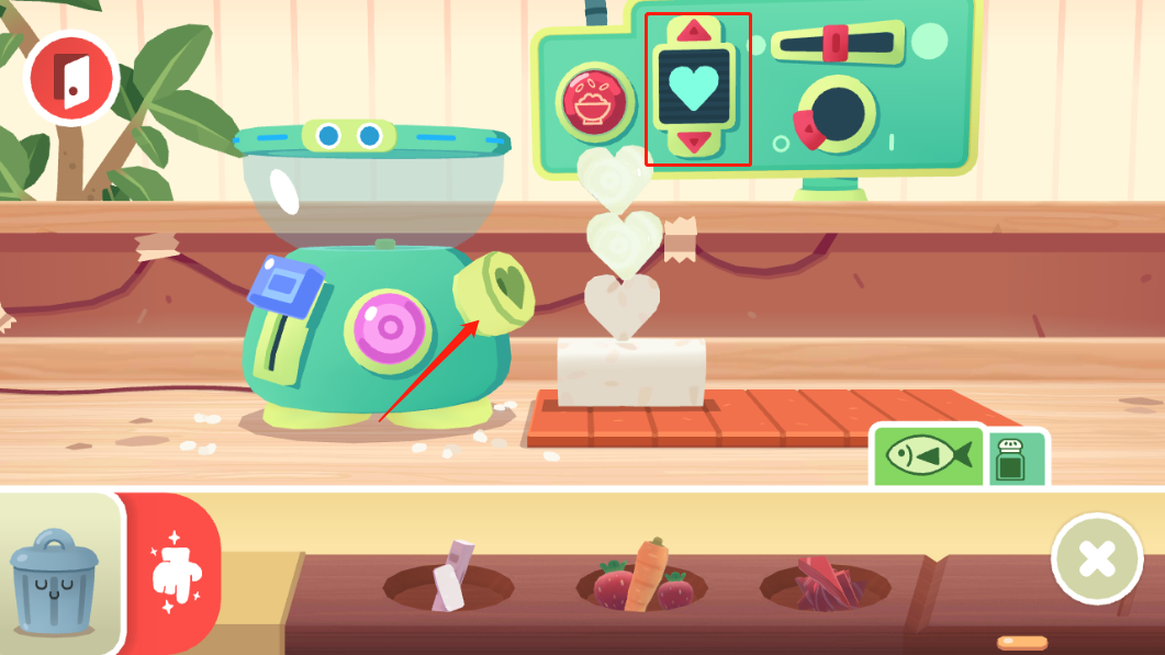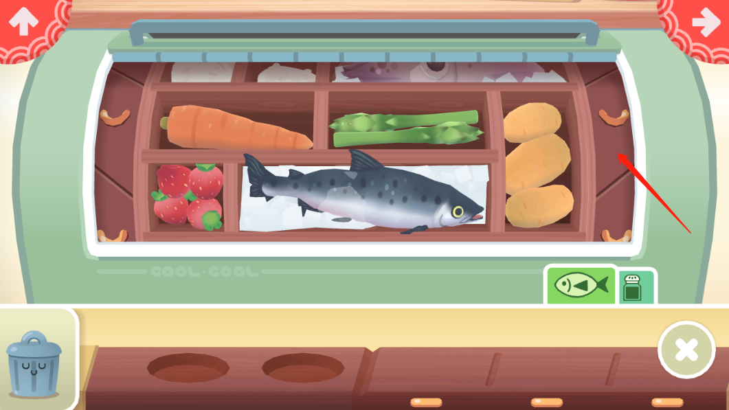 2、进入游戏后,点击下方的冰箱,滑动下图这个地方,会出现大大小小的材料,蔬菜也好海鲜也罢,任君挑选;反正材料无限供应,没有目标的时候随便拿就好;