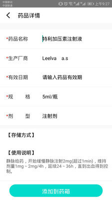 把新配的或家里的药品、保健品添加到“滴脉药箱”,从此之后,各种药品的名称、厂商、规格、剩余数量、失效日期等等,全部一目了然。不仅一家人心中有数,在看医生的时候,也可以拿给医生看,避免再配重复的药。