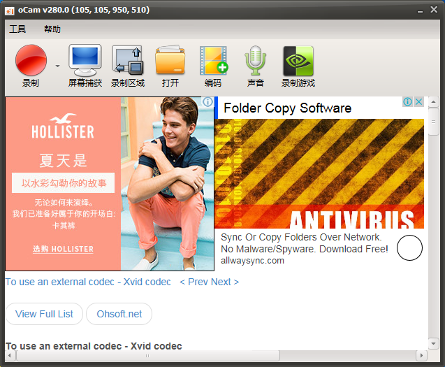 使用内置的视频编解码器的记录(AVI,MP4,MOV,FLV,TS,VOB)和音频编解码器(MP3)和实时音频编码,可以记录你使用外部VFWcodec。有大的 视频格式支持超过4GB。
