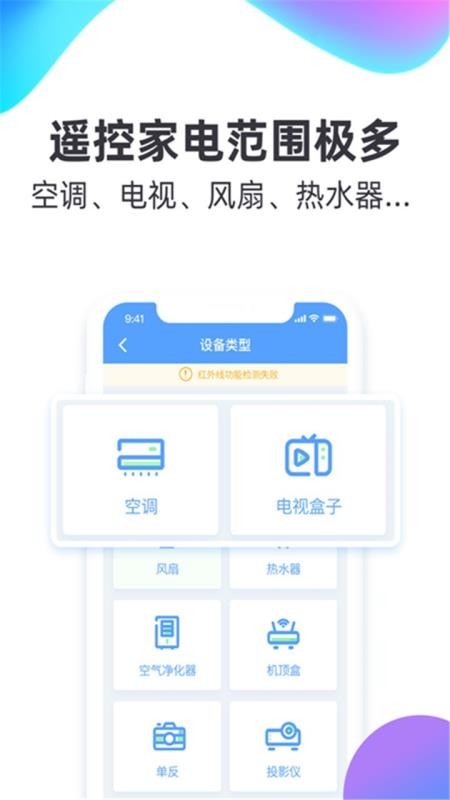 支持遥控空调、电视、机顶盒/卫星、网络机顶盒、投影仪、DVD、功放、风扇、单反、开关/灯泡等数十种家电,手机遥控无压力。