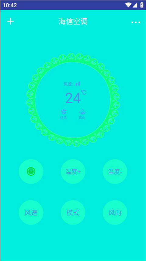 3、进入空调按键页面,可以看到有温度、风速、模式、风向等功能键,点击电源键打开;
