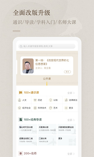 4、名家深入解析,全球知识趣味而严谨的讲述,产品结构及内容更加清晰流畅,100+通识基础课,100本人类经典导读,200+名师社群及学科入门课程,文学、哲学、政治、经济、天文、法律、艺术、心理、考古、数学,总有内容契合您的认知圈。2、平台上的教师都是专业的学者和名家,为用户带来最专业的讲解;