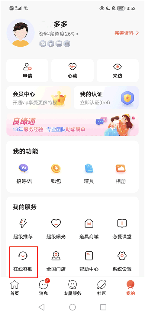 1、首先,打开应用,在“我的”界面中找到并点击“在线客服”选项;