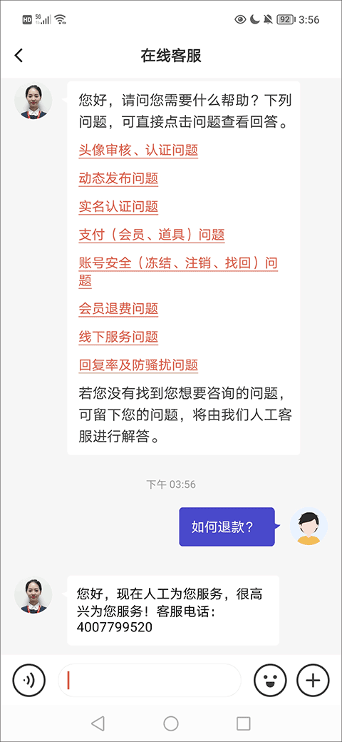 2、在在线客服界面就可以找到会员退费问题,用户也可以在这里直接输入“如何退款”的字样,获取相关回答;