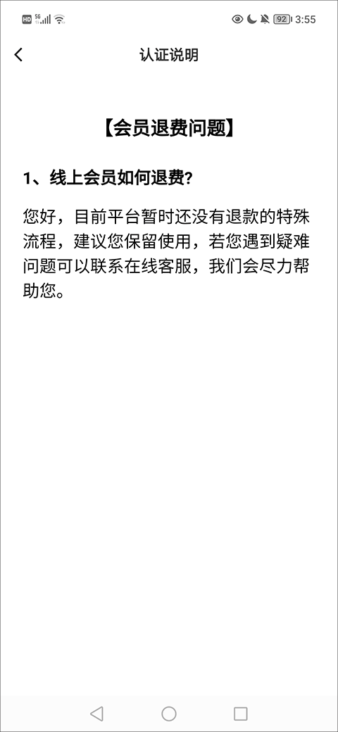3、最后,用户就能在认证说明中找到会员退费的答复了。