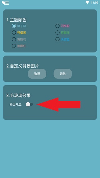 在主题界面可以自定义主题颜色和背景图片,毛玻璃效果需要用户手动开启。