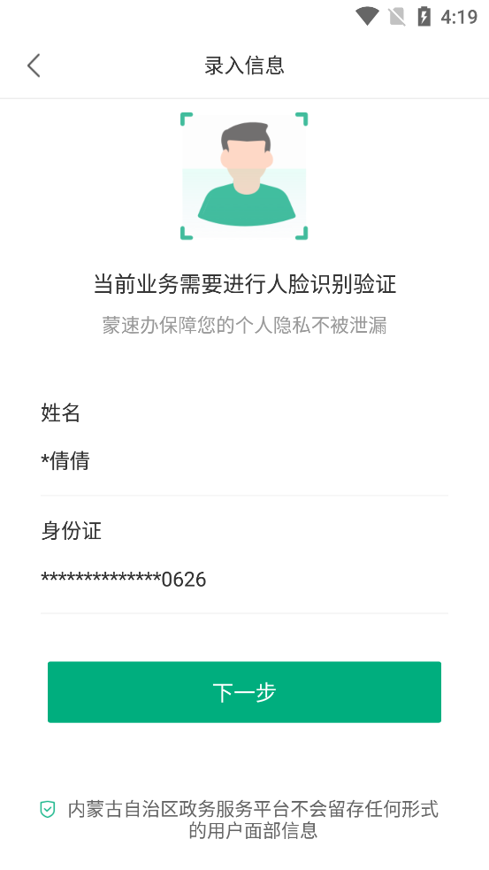 5、信息正确后,点击下一步,进行人脸识别;