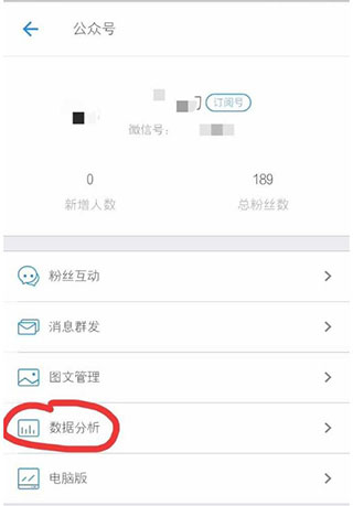 6、在公众号设置中,选择数据分析,然后进行下一个步骤;