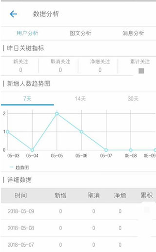 在用户分析的页面中,我们可以查看到微信公众号近几日的关注和取关数据。