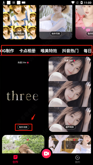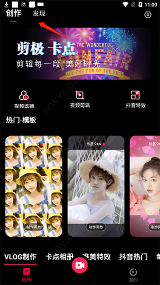 3、而在“创作”中主要提供了视频剪辑功能和海量卡点模板素材,有喜欢的模板即可直接点击制作同款;