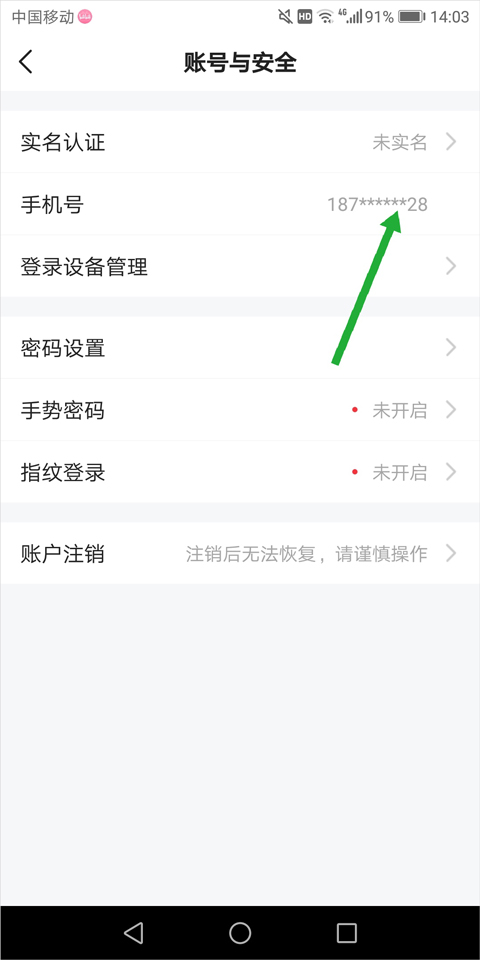 用户修改手机号是不可以通过进入我的页面中的设置页面里的【账号与安全】一栏中进行修改的,下图绿色箭头所指的地方可以看出手机号无法通过这种方法进行修改,因为用户点击时软件无法响应出新的页面。