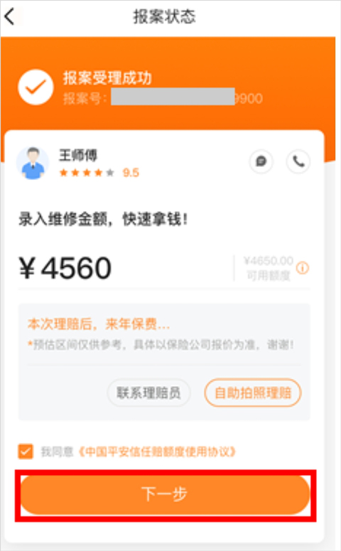 第一步∶报案成功后,符合条件的用户系统会为其自动匹配信任赔通道,请在额度范围内录入维修金额,然后点击“下一步"按钮