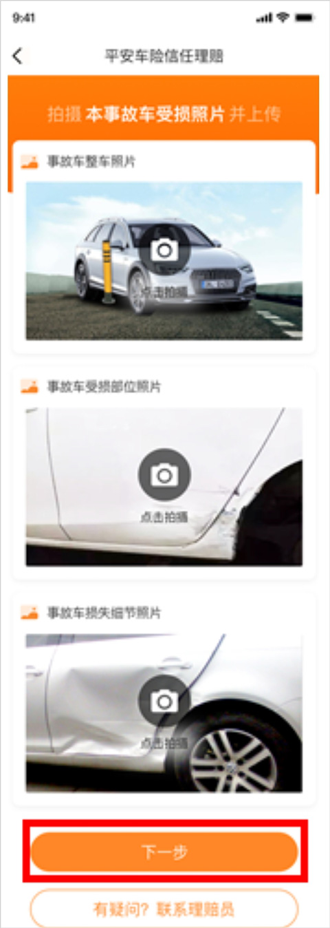 第二步:按照要求拍摄本事故车受损照片,然后点击“下一步"按钮