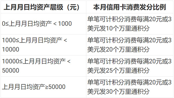 每月6日至次月5日入账的可计积分消费,参考持卡人在我行借记账户的上月月日均资产不同层级进行发分;单笔可计积分消费金额按人民币20元倍数向下取整计算积分;美元3元倍数向下取整计算积分