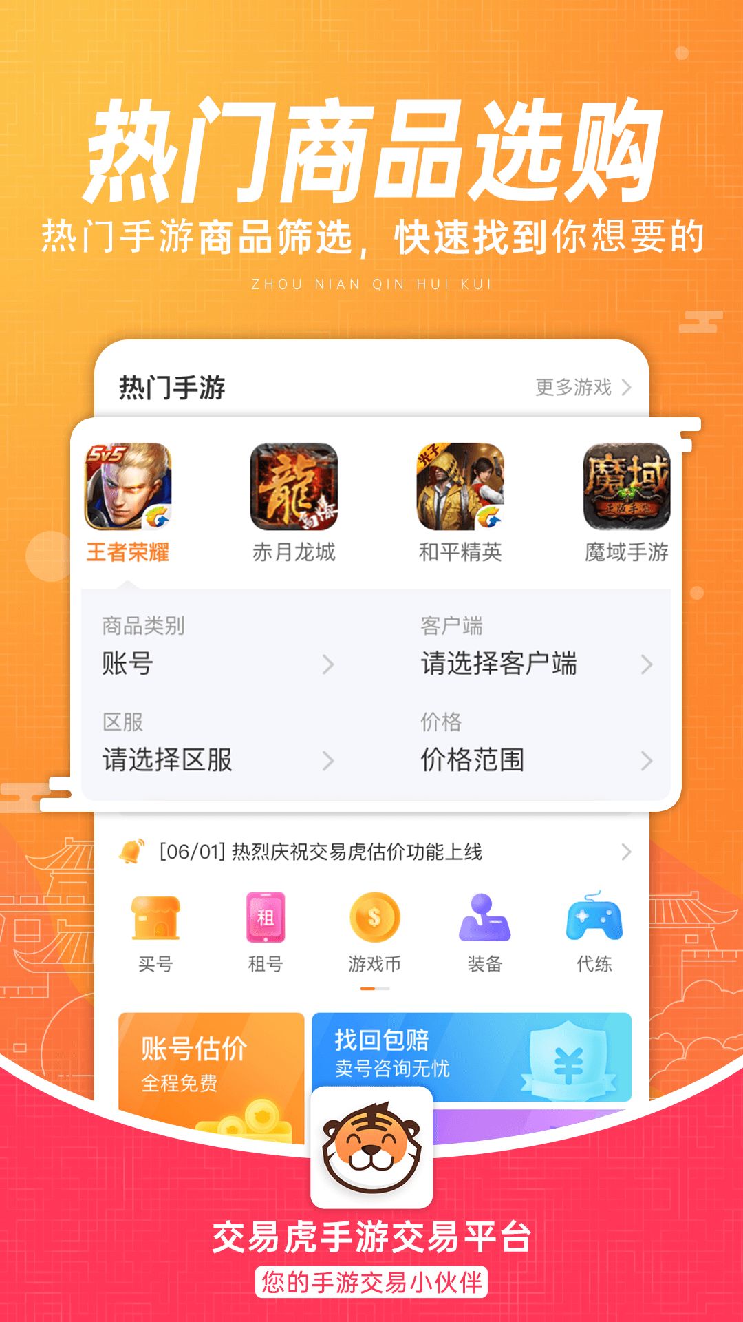 交易虎手游交易app是一个专业手游交易平台,为玩家提供账号交易、折扣道具、游戏币、代练等多项服务。我们有找回包赔和回收账号等特色服务以确保交易的安全快捷,欢迎玩家在交易虎进行账号买卖。