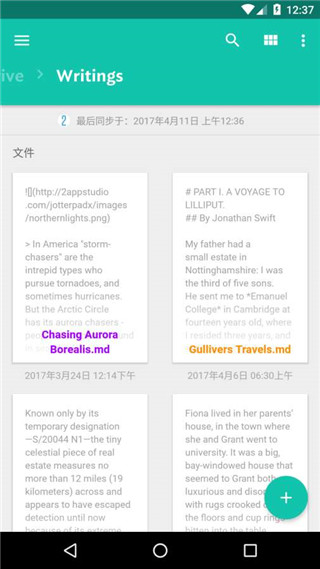 连接至所有的你喜欢的云端服务(Google Drive, Dropbox, OneDrive),并继续在任何地点书写,哪怕离线也可以。JotterPad会使用它强大的同步功能,在你在线时同步你的作品。您也可以用Cloud+链接无限数量的云端服务!