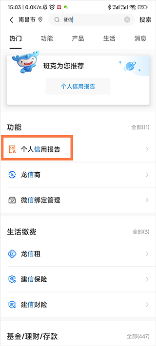 1、打开APP并登录 >> 在首页顶端搜索框中输入“征信”并点击“个人信用报告”