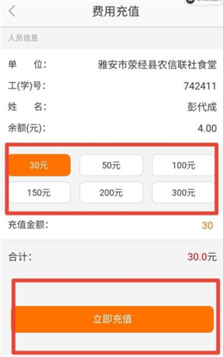 选择充值金额,点击"立即充值"