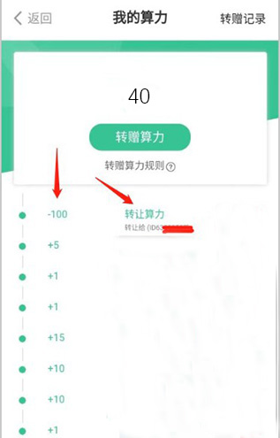 6、接着我们我们按照红色箭头所指,填入对方的陀螺ID,然后选择需要转赠的算力数额(目前只能选择50、100、200三种),最后点击“确定转赠”按钮,成功后得到下图。