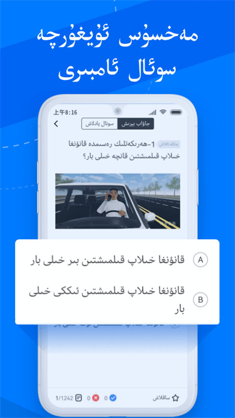 ,在收集了维吾尔族特色语言的基础上。其书写方式遵循维语从右至左的传统,这里涵盖了广泛的驾考知识点,用户可以在线学习理论知识和观看学车视频,能够在线答题并参与模拟测试,如果你需要考取驾驶证,这无疑是一个极好的选择,可以说是驾驶学习的必备工具,众多驾校强烈推荐!在驾考宝典维语版中,专门针对维吾尔族用户打造了一个学习平台,知识拓展包括易错题和重点难点一键巩固,确保每位学员都能顺利通过考试。少数民族语言文字丰富了中华文化,是中国文字史上不可或缺的一部分,对民族文化的发展起到了重要作用。世界上的语言文字每天都在消失,保护语言文字的多样性具有深远的历史意义,驾考宝典将积极响应这一号召,致力于满足全国各地不同地区人们的学车需求。因此,有需要的用户请尽快访问本站下载使用吧!