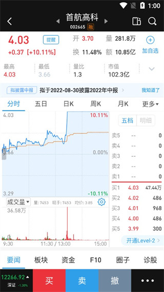 3、我们可以查看选中股票的近期走势以及K线图进行分析,如果喜欢可以选择买入。