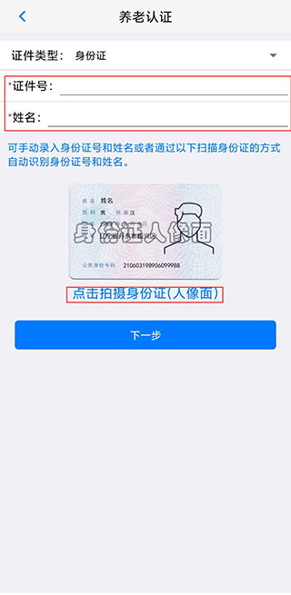 3、也可以直接“点击拍摄身份证(人像面)”自动识别身份信息,输入完后点击“下一步”即可;