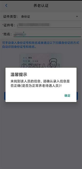 4、如果您是正常养老待遇人员,那么就能直接认证,反之,就会提示未找到。