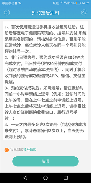 2、阅读“预约挂号须知”并点击底部“挂号”按钮