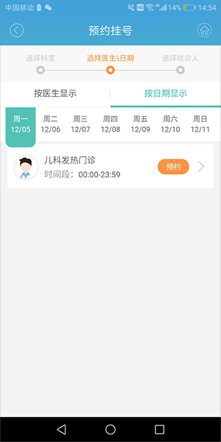 4、选择挂号信息显示方式(此处采取默认显示方式:按日期显示)并点击挂号信息右侧的“预约”按钮