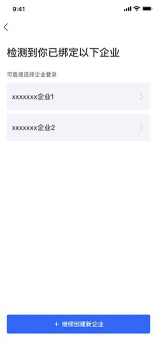 3、如该员工已绑定多个商旅账号,会进行二次验证,此时可继续点击创建新企业;