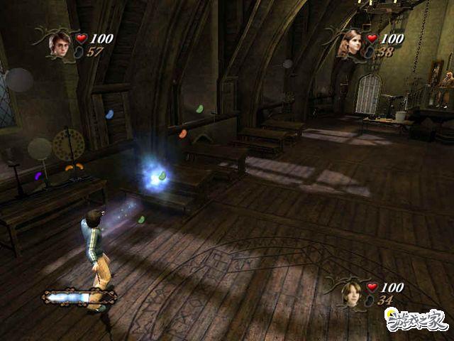 黑魔法防御课在游戏中被设计成了两个小的关卡。首先哈利波特的任务就是要找到一本魔法书。这个任务需要连续通过几个房间,而途中还有怪物的骚扰。进入任务前可以选择自己控制的人物,而对于初期能力相差无几的哈利波特、郝敏和罗恩来说,根据自己的喜好随意进行选择即可。至于路上遇到的那些怪物,在三个人协力的攻击下也不会带来多大的麻烦,只不过小心不要让自己控制的人物过分冒进,毕竟没有同伴的帮助,一个人面对怪物还是有些吃力的。但是好在游戏的难度不高,即使人物的生命值降到0也会直接复活。除了进一步熟悉游戏的操作特点以外,在这个任务中最重要的就是收集“魔法豆子”。用魔法攻击一些物品,例如水桶、木箱等,都会出现数量不少的豆子,及时收集它们,才可能在初期购买更多的剧照来增强人物能力。