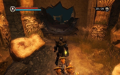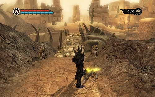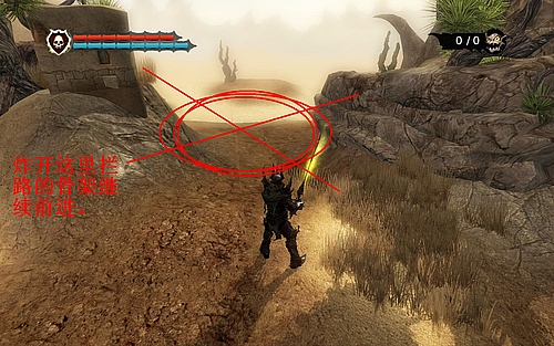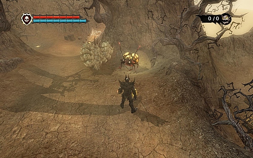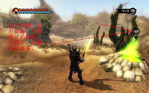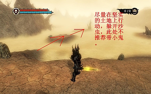顺着路走很快会来到这里,不要进入半路的小型沙漠,里面有3,4只沙虫,后同。这里可以找到第一只爆炸虫,使用F12魔法之后站在它的身后将它一点一点赶进沙漠,知道最后被沙虫吞掉,2只爆炸虫即可解决沙虫。还有一个办法是找到爆炸虫的蛋(1个草篮子,里面有很多小爆炸虫样子的东西),派小鬼抬着蛋走,爆炸虫就会自动跟上,引进沙漠即可。需要注意的是,爆炸虫不肯轻易离开自己的巢穴(出生地)要小心不能让他跑回去。
