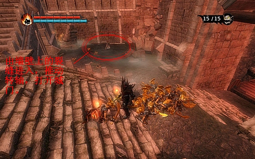 推动这里的转轴,打开城门(游戏里很多地方的迷宫都是环形的,一番冒险最终将你引导回入口)