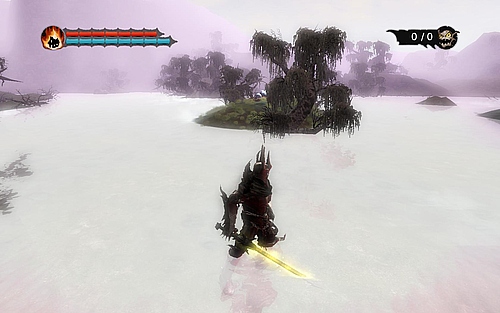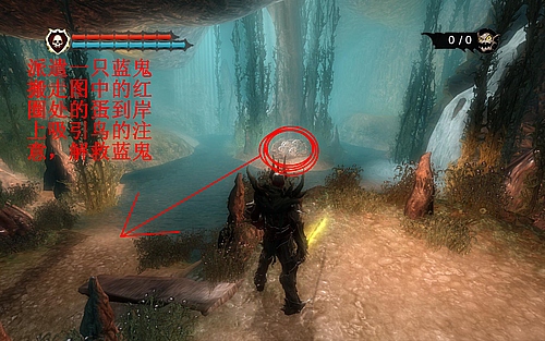 在这里再次与小鬼分开,独自从水里走。在前面的陆地处停留,发生剧情