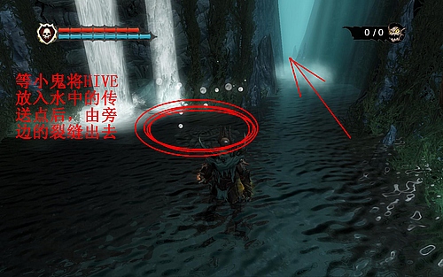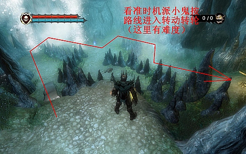 前进至喷泉处,看准时机派小鬼躲过秒杀泉(- -b),推动转轮