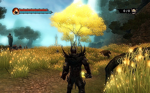 返回大树,与Oberon展开决战!(摆个造型)Boss本身不会移动,会放出一些从地上冒出的根须进行进攻,即时躲开伺机反攻。Boss每收到一定的伤害就会放出一些小怪,到了后期更是会有小怪与树根同时出现的状况,小心应付。需要注意的是蓝色的胖子,他的震地虽然间隔长,但每发攻击力超强,即时唤回你的小鬼避免减员。杀死Boss后进入他身后的道路,来到Golden Hills。