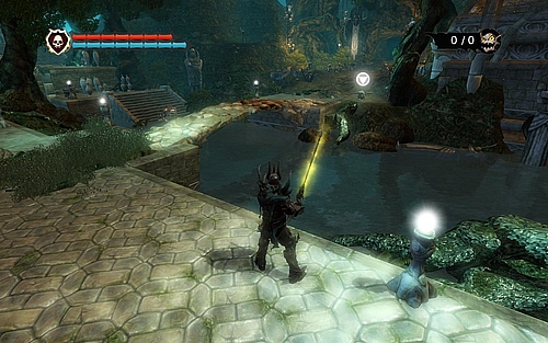回到大树下,进入一个小门延树根走可找到左1号树根底部。中途会路过这里,再处理完之后回来这里,用蓝色小鬼过河搬动对面的转轮放下石桥(注意青蛙)之后进入骸骨洞