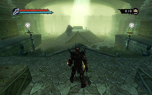 神殿的目的是找出所有里面放光的棺材,精灵可以躲过也可以用蓝鬼杀死。值得注意的是这里,可以利用两侧的转轴将巡逻进里面的精灵困住,之后可以前行至最后处理最后的根须