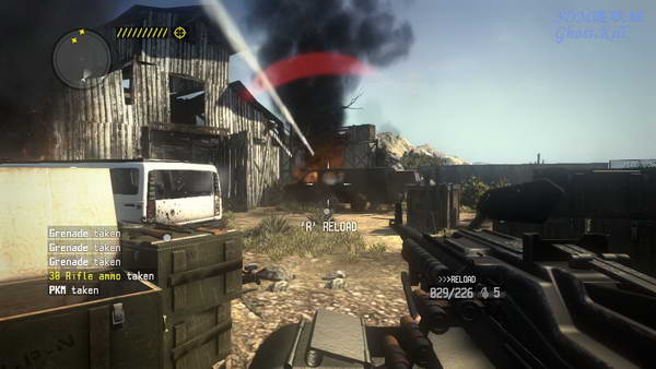 进入一个谷仓,破门而入杀光里面的敌人,外面的敌人把谷仓点着了, 到木门这里把锁打烂出去,出去后立刻找掩护。