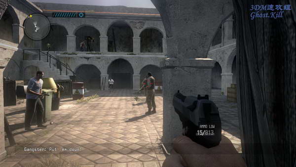 下楼后一直杀到院子中间,这里可以看到很多武器,在地上捡一把重机枪开始屠杀, 院子里的杀光后又会有一群坐汽车来的,全部杀光后回到武器堆这里过关。