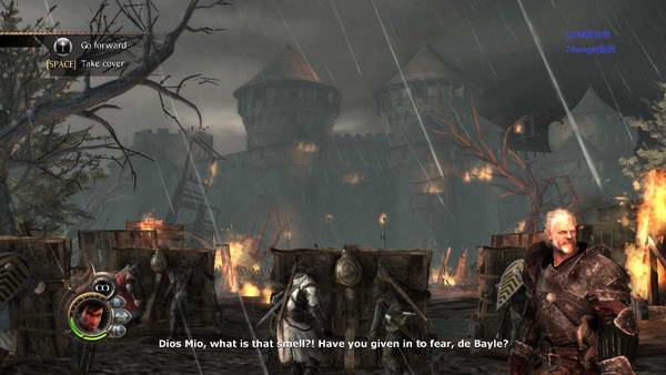 和另一个同伴推着板板车攻城,一直按住W前进,走的时候要注意如果听到有人发出杀猪式的鬼叫的时候,马上按住空格键躲避从城墙飞来箭雨(共有三波攻击),然后继续向前推进,到城门以后,猪脚会拿出弩射死城门口的几个杂兵(按住A键出来,用鼠标移动瞄准,右键射之,按D键躲回来上膛!)杀死门口的以后,在搞定城墙上面的就进城了!进去以后用弩射死城墙上的两个小兵以后在按照提示和同伴使用攻城车把城门撞开!