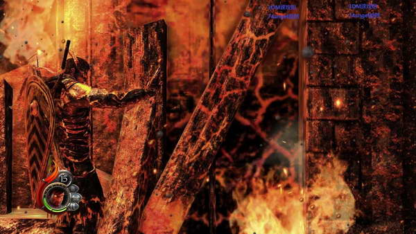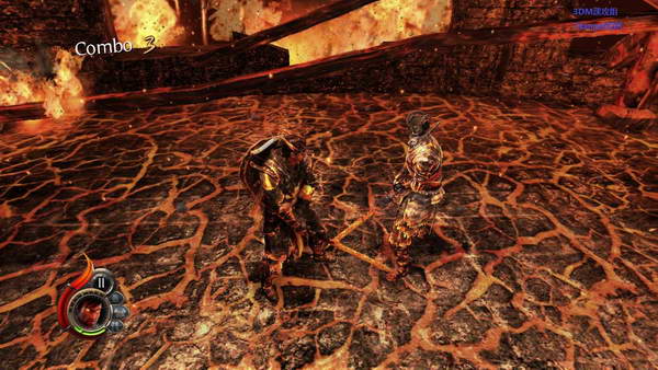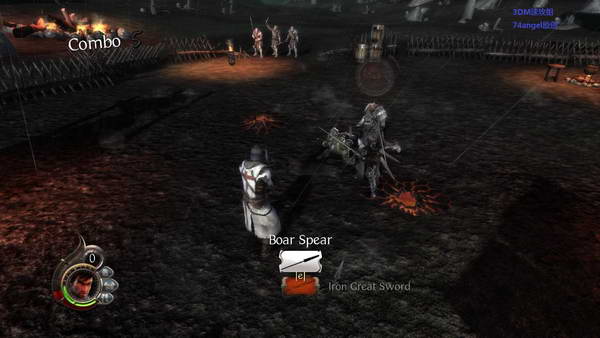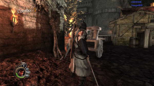 进入一场混战,解决一堆杂兵后。对面木台上面会跑出三个弩兵,按←键切换成弩射死以后,在同伴的协助下爬上木台。一直往前走,路上会遇到几个杂兵,解决后会看到其他人正在交战,后进入一场混战以后,速战速决,去过协助同伴把挡在楼梯旁的弩车推开,然后上楼梯进入一个房间(二楼有一个木箱)进去侧面有一个门进入走廊,通过走廊后进进入CG遇到BOSS。