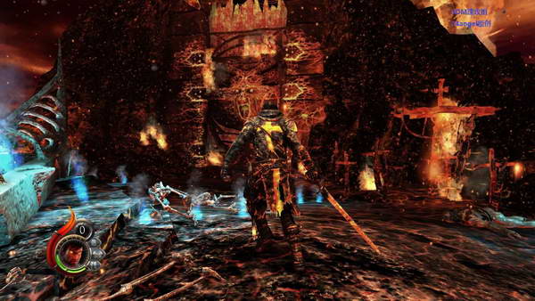 这关一开始猪脚就变成“牛魔王”了,一路往上杀路上全部都是骷髅,一刀一个!杀到上面去以后,出现一帮骷髅,提示用SHIFT+E打出龟波气功消灭他们,然后在对准大门,放几个把大门打开!然后往前走,会从地下冒出一大堆骷髅,蓝色的可以用刀砍,红色必须用龟波气功打!消灭完后,对面十字架周围的火焰就会消失,然后再用龟波气功打碎!然后大BOSS出现了,搞定他以后就可以下班回家吃饭!