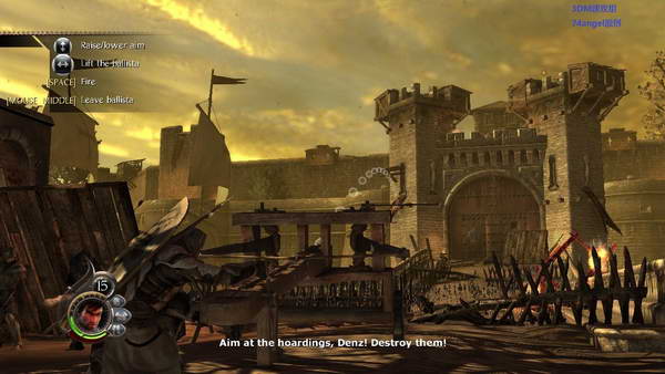 用弩车把城墙的武器射掉,A,D键移动方向,按住W键加力,然后空格键发射!然后上去杀掉卫兵,变身破坏大门。一直杀过去,清完卫兵,旁边的护栏一个地方烂掉了,变身按E键打开,到下面去,然后在变身用火球打碎墙壁进去。一直往前走,会遇到一帮很猛的弩兵,消灭他们然后到房间里面来打开机关。然后出来,从城墙上面绕到对面高出去,过关!